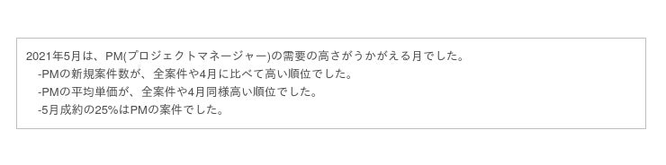 5月は4月や全体と比べ、「PM(プロジェクトマネージャー)」が上位に位置しています。プロジェクトをまとめる役割であり、高い能力が求められるPMは需要も高く、今後も上位に位置することが予想されます。