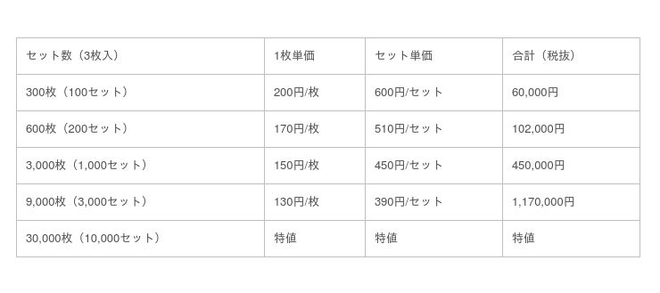 卸価格でのご案内のため、ご注文は300枚(100セット)からとなっております。それ以下の枚数での販売は現在行なっておりませんので、あらかじめご了承ください。
