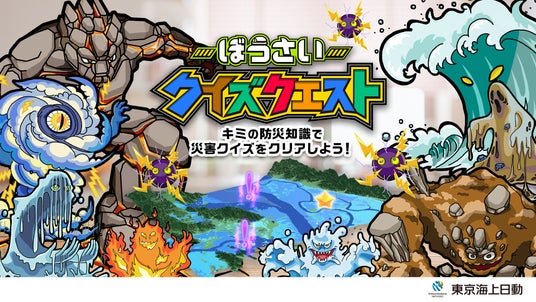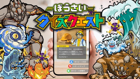 「ぼうさいクイズクエスト」では、災害のジャンルを12種類「液状化、大雨、火災、ゲリラ豪雨、洪水、地震、雪氷、台風、高潮、津波、土砂、落雷(五十音順)」それぞれの災害をモチーフにした恐ろしいモンスターがクイズを出題します。また、災害以外にもぼうさい博士キャラクターから備蓄や避難に関するクイズが出題され、楽しく学ぶことができます。