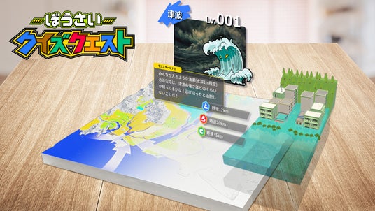 防災関連のイベントへの出展も多数予定しており、イベントでは筑波大学の芝原教授が作成した精巧な地形ジオラマを用いて、津波や洪水などの災害シミュレーションをARで観察することができます。ジオラマ上では複数の防災クイズが出題され、解答するとそれぞれの防災知識に関するAR解説が楽しめます。
