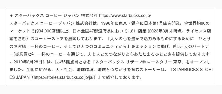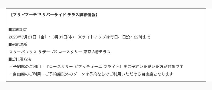 スターバックス コーヒー ジャパン 株式会社[本社所在地:東京都品川区、代表取締役最高経営責任者(CEO):水口 貴文)]は、2023年7月21日(金)から8月31日(木)まで、スターバックス リザーブ(R) ロースタリー 東京(以下、ロースタリー 東京)の3階テラスに、緑あふれる夏の目黒川の水辺を感じながら夕飲みを楽しめるサマーシーズンだけのテラス空間、「ARRIVIAMO(TM) RIVERSIDE TERRACE(アリビアーモ(TM) リバーサイド テラス)」をオープンします。