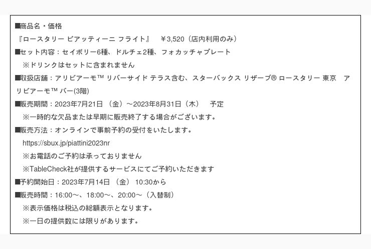 さらに同日より、カクテルと合わせてイタリアの食文化を楽しむのにぴったりな、セイボリー・ドルチェ全8種が並ぶ『ロースタリー ピアッティーニ フライト』がより華やかになって登場いたします。独創的なカクテルが味わえるアリビアーモ(TM) バーとイタリアンベーカリー プリンチ(R)がコラボレーションしてつくりあげた贅沢な味わいを、夏の心地よい夕暮れや川のせせらぎとともにお楽しみください。