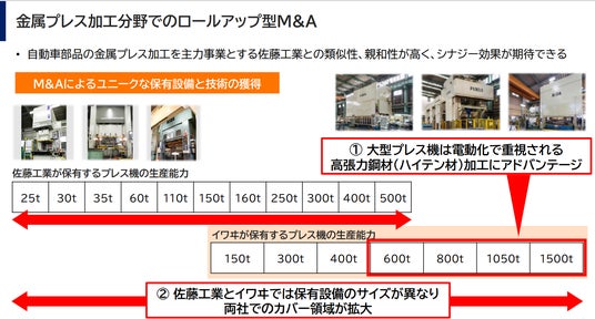 当社の子会社で自動車のオートマチックトランスミッション部品の金属加工メーカーである佐藤工業株式会社(本社:愛知県あま市、代表取締役:植村達司 以下、佐藤工業)とは、自動車用部品のプレス加工が事業の中心である点において類似性・親和性が非常に高い一方で、プレス機の対応領域、得意とする部品のカテゴリー、顧客の重複が少なく補完関係にあることから、当社グループにイワヰを迎えることにより、両社の強みを活かしたシナジーを発揮することができると考えております。