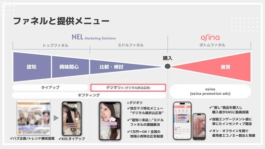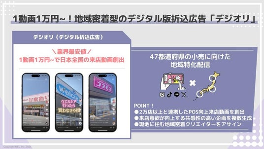 ブランドとお客様を“推し”でつなげるプラットフォーム「osina」の運営やSNSを活用したOMOマーケティング支援事業を提供するNEL株式会社(本社:東京都渋谷区、代表取締役社長:西田 陸)は、2024年8月29日よりSNSを活用した店舗来店特化のデジタル版折込広告「デジオリ」の提供を開始いたします。