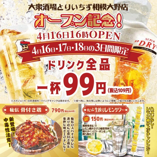 24年4月16日(火)大衆居酒屋とりいちず相模大野店新規オープン。オープン記念として16日(火)、17日(水)、18日(木)の3日間限定!何杯飲んでもドリンク1杯99円(税込109円)セール開催!