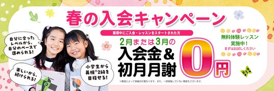 ・月謝の無料特典は、2月または3月のレッスンのみ対象です。2月または3月の途中や後半に入会された場合も、2月または3月の月謝の無料特典を翌3月、または翌4月以降に繰り越すことはできません。 ・キャンペーン実施月(2月または3月)以降も継続して受講いただける方が対象となります。