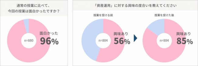 実際に授業を受けた生徒の9割以上が「面白かった」と回答。また、授業の前後で「お金」「資産運用」に対する興味も上がっていることがわかりました (※2019年度の授業を受けた高校生の授業後アンケート結果より・回答数884人)。