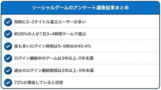 ソーシャルゲームの利用状況についてアンケート調査を行った結果、利用状況はユーザーによって様々ではありましたが、ゲームにログインするタイミングやログイン継続期間は偏っていました。