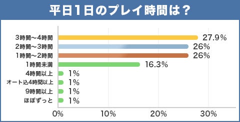 約28%以上の人が、1日3~4時間ほどゲームをプレイしています。続いて2時間以上~3時間未満の人と、1時間以上~2時間未満の人が26%ほどでした。
