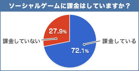 ソーシャルゲームの課金については、72.1%の人が課金していると回答しています。無課金の方は27.9%と30%を下回っています。