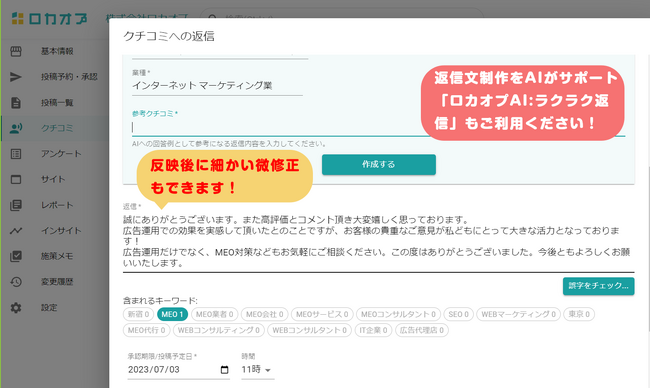 ▲例えば、クチコミ返信の誤字脱字チェックをロカオプAIを使うことでダブルチェックの時間を減らし、工数を削減できます。