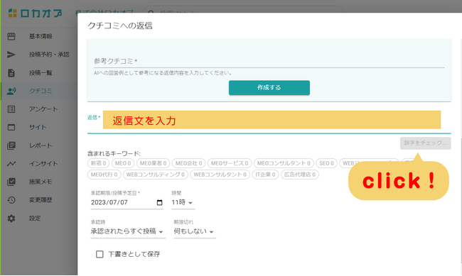 1.「クチコミ」>「編集」にアクセスし、返信の欄に誤字脱字チェックをしてほしい文章を入力して「誤字をチェック」をクリックしてください。