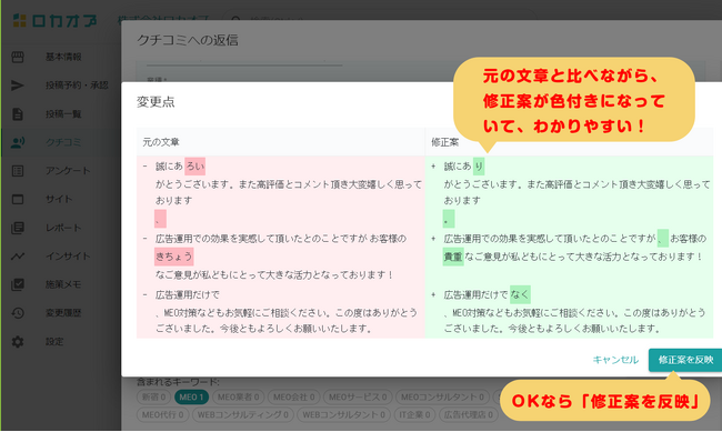 Googleマップのクチコミ返信のAI誤字脱字チェック機能『ロカオプAI:AI誤字チェック powered by GPT-3』が登場しました。手間がかかる原稿のダブルチェックの工数を削減します。