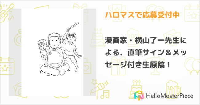『きょうの横山家』『戦国コミケ』『新しいパパがどう見ても凶悪すぎる』などの作者で漫画家の横山了一先生による、本人のサインとあなたへのオリジナルメッセージ入りの生原稿を購入できるすごいギフトです。