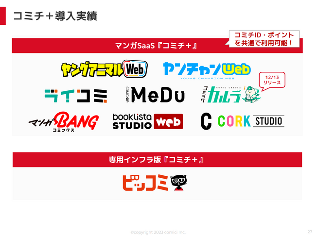 白泉社「ヤングアニマルWeb」、秋田書店「ヤンチャンWeb」、小学館「ビッコミ」(専用インフラ版)と、出版社のWebマンガ誌のインフラを担っています。