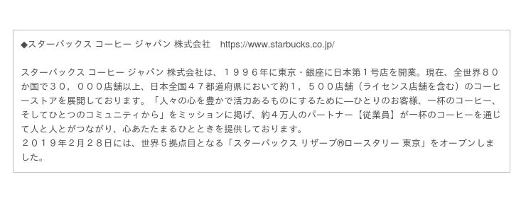 スターバックス コーヒー ジャパン 株式会社は、特殊な商圏等への出店について、価値観・マインドを共有でき、商品とサービスのクオリティに強いこだわりを持つ企業とライセンス契約を諦結した上で店舗展開を行っており、今回で7社目の契約となります。2004年2月にライセンス1店舗目をオープンし、空港X線ゲート内、新幹線改札内や駅構内、書籍店内、企業内、病院内、大学キャンパス内等、全国で124店舗出店しております(2019年12月末時点)。