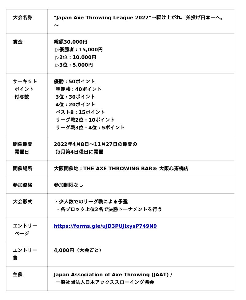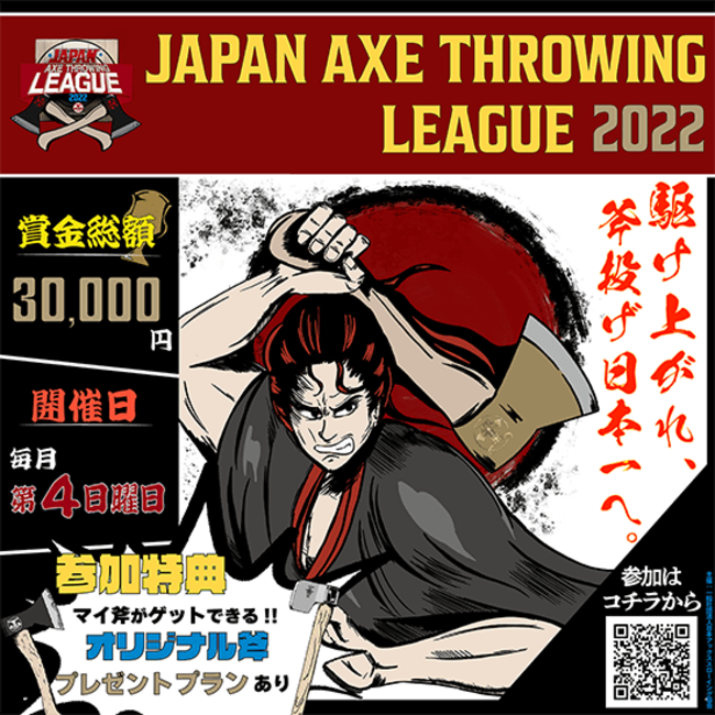 「"Japan Axe Throwing League 2022"~駆け上がれ、斧投げ日本一へ。~(以下、「当大会」)」とは、東京と大阪で毎月第4日曜日に開催される、誰でも参加可能なAXE THROWING(斧投げ)の大会となります。当大会に参加、もしくは上位入賞することで、「斧投げ日本一決定戦。"Japan Axe Throwing Championship 2022 @TOKYO"」への出場権を獲得するために必要なサーキットポイントを貯めることができます。その他にも、参加者限定の特典として協会オリジナル斧とAXE THROWINGの利用料がセットになったお得なパッケージプランの購入や、上位3名までには賞金が与えらます。