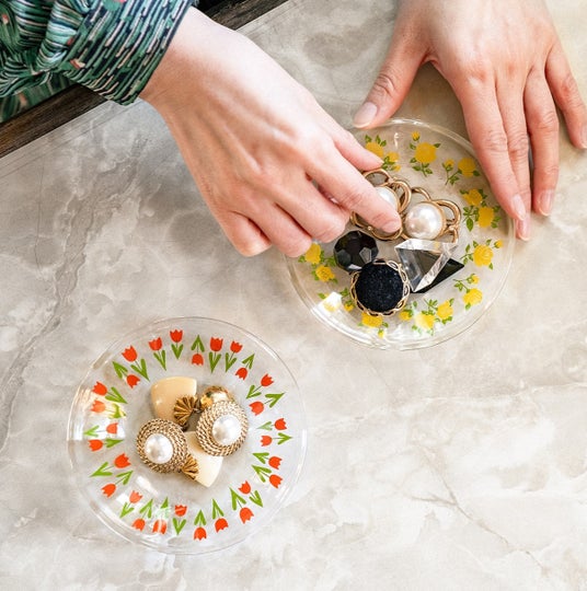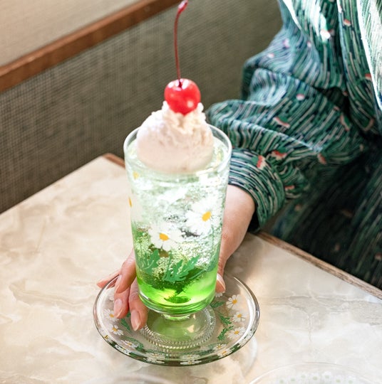 アデリアレトロおなじみの花や動物の柄をプレートの縁にぐるりとあしらいました。デザート用の小皿としてはもちろん、アクセサリーなどの小物入れとしてもお使いいただけます。また同シリーズのグラスを乗せてコースターのように組み合わせれば、喫茶店のような特別感を演出できます。