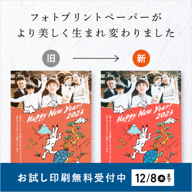 「年賀家族」では今回リニューアルしたフォトプリントペーパーを含む、高品質な3つのペーパーをご用意。「お試し印刷」では、質感の異なる3種類の用紙にお客様の作品を印刷してお届けいたします。写真が引き立つ最高品質の仕上がりをお確かめください。