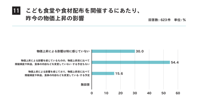 ・物価上昇による影響を感じているが70%で、そのうち、物価上昇によってこども食堂を開催するにあたり何等かの変更をしている・する予定と回答しているのが15.6%