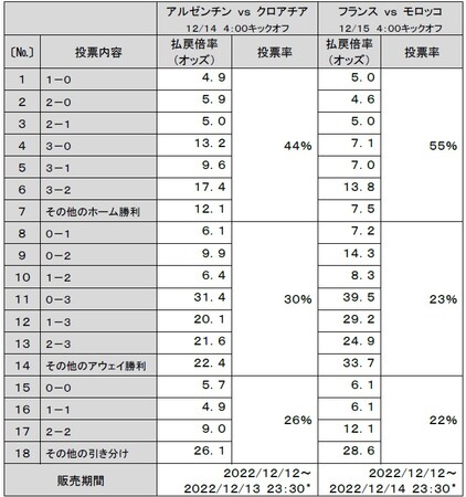 ※3 「WINNERサッカー1試合予想」のうち、クロアチアおよびモロッコが勝利する投票内容(No.8~No.14)に投票された割合の合計です。なお、投票内容は90分間の試合結果の予想となります。延長の結果は含まれません。