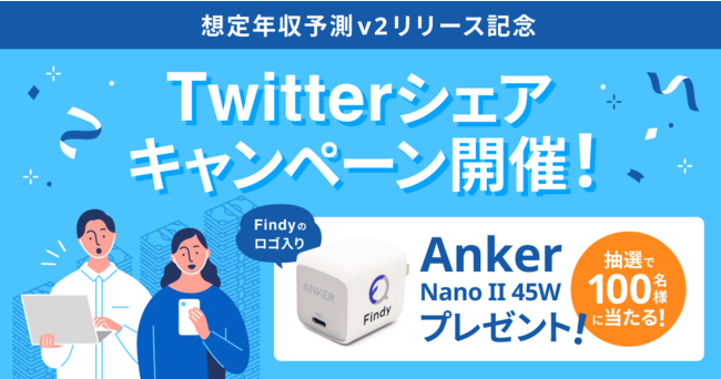 「#想定年収予測v2」のハッシュタグをつけて、Twitterにツイートして応募すると、抽選で100名様にFindyロゴ入り「Anker Nano II 45W」をプレゼントします。