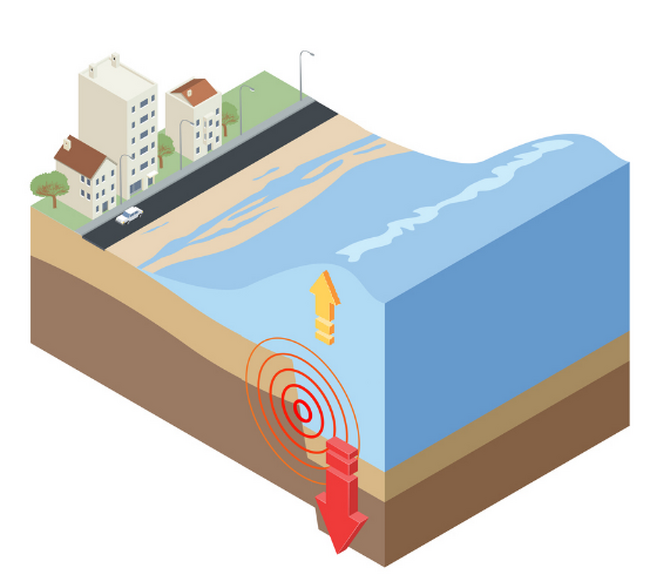 通常、海の波は海面に吹き付けた風による風波の集合体で、潮位の満ち引きと組み合わさって大きさが決まります。こうした通常の波と異なり、地震や海底火山の噴火などの要因で発生する津波は海底地形の盛り上がりを受けて、膨大な量の海水が数十km~数百kmの波長で押し寄せるため、たとえ数十センチでも通常の波とは比べ物にならないエネルギーを持っています。30cm程度の津波でも、巻き込まれると大人が立っていられないほどの力があり、50センチになると車が流される程になります。