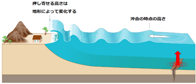 津波は岬の先端や湾奥の特殊な地形に押し寄せた場合、波が集中し高さを増して押し寄せることが知られています。また、陸地に到達するまでに複数の波が重なって高くなる場合もあります。このため、沖合では数十cmの高さの津波でも、実際に陸地に押し寄せる高さは各地点で異なります。