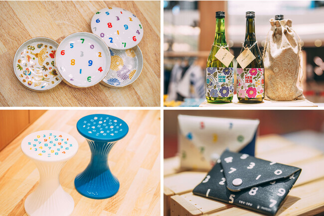 香港で人気の7 つのブランド「TIMES SQUARE」「BEIS」「香港酒造」「FingerART」「PAPEY」「Red A」「By Leona」とコラボレーションした、ポップなアイテムも勢ぞろい。左上から時計回りに、ライフスタイルブランド「By Leona」のキャンディーボックス/香港初の日本酒酒造「香港酒造」の日本酒/ ペーパーアートデザインブランド「PAPERY」のミニウォレット、生活雑貨ブランド「Red A」のスツール