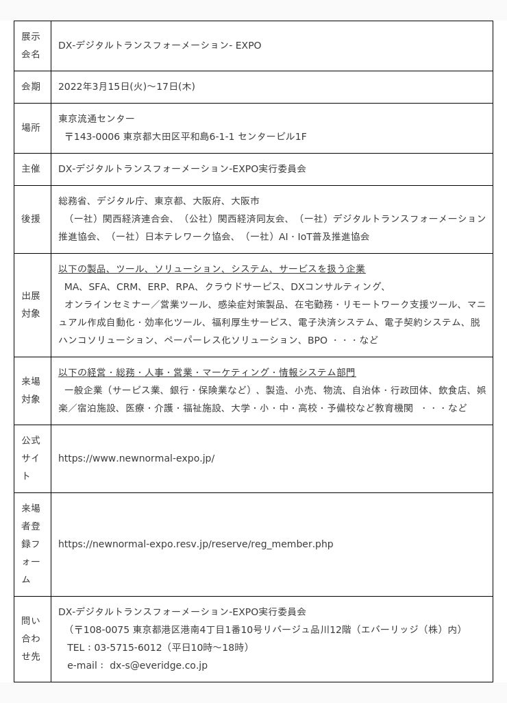 DX EXPO実行委員会が運営する、DX(デジタルトランスフォーメーション)を促進するMA(マーケティング自動化)、SFA(セールス自動化)、RPA(業務自動化)、コンサルティングサービス、新しい生活様式を実現するための感染症対策製品、在宅勤務・テレワーク支援ツール、福利厚生サービスなどあらゆる製品・ソリューションが出展し、企業の経営、総務、人事、営業、マーケティング、情報システム部門が多数来場するビジネスマッチングのための専門展示会です。