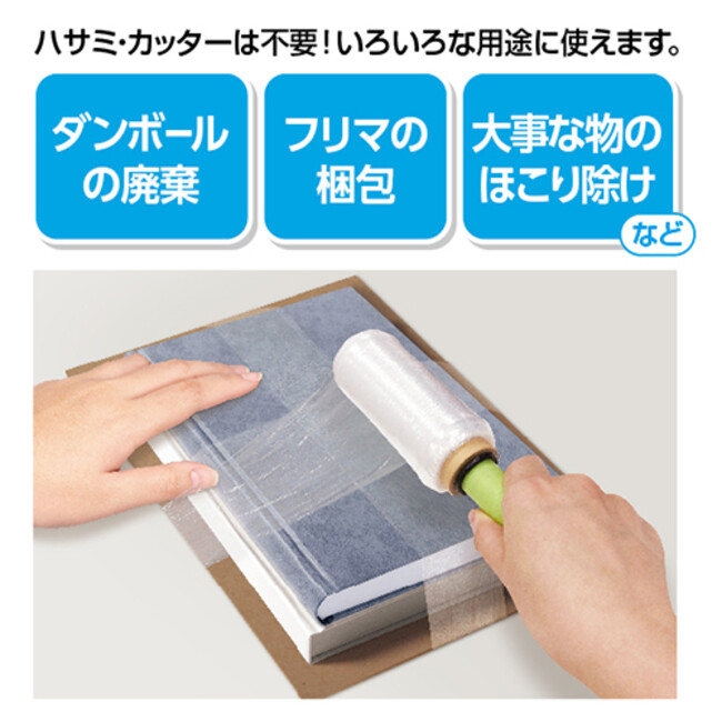 「ひもの代わりになるフィルム くるピタロール」はハサミやカッターなど使用せずに、ダンボールの廃棄やフリマ梱包時に商品をフィルムで巻いて束ねる作業や、大事な物のほこり除けなどに手間をかけずにピタッと巻けるフィルムです。
