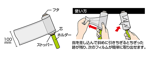 フィルムと巻き取り棒がセットになった本体とフィルムの付替え用の2種類の品揃えで、サイズは幅100mmで150mt巻きです。
