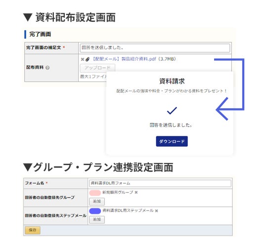 また、フォームから獲得した顧客を既存のメール配信グループへ連携することが可能となり、ステップメールを活用した自動追客も実現できます。