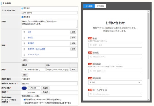 フォーム項目や入力例だけでなく、フォーム入力後の完了画面やメールも自由に設定できます。 作成したフォームはWebサイトに埋め込んだり、URL化して共有することもできるので、自社の運用に合わせてご活用いただけます。