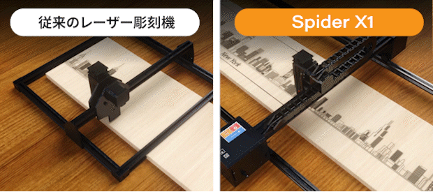 従来のレーザー彫刻機は加工範囲の制限があり、大きなサイズの加工には対応できませんでした。Spider X1は、フレームの制限をなくし、Y軸方向の加工範囲を無限にしました。これにより、長さのあるプロジェクトでも材料を再配置する必要がなく、スムーズに加工することができます。