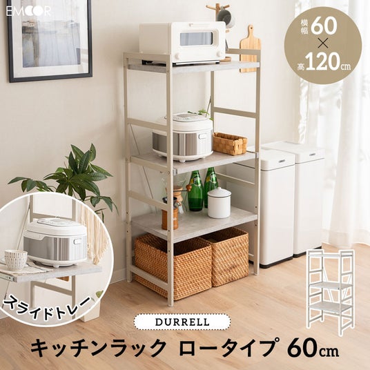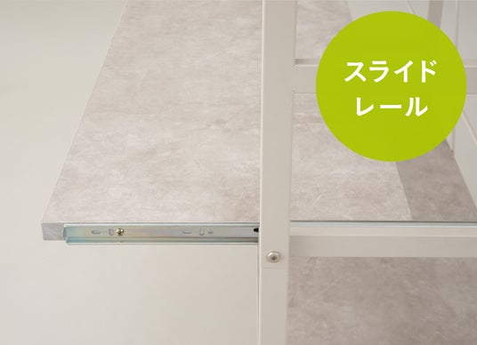 セラミック調のボードで洗練された印象キッチンラックは、どんなインテリアにも馴染みます。見た目だけでなく、ポットや炊飯器などの蓋つき家電もたっぷりスペースで快適にお使いいただけます。スライド式トレーだから、使用する際もスムーズです。