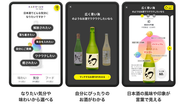 KAORIUM for Sake は、「癒やされたい」「ワクワクしたい」などのその日の気分と、店頭にある日本酒とのマッチ度を計算し、相性の良い日本酒をレコメンドします。また、気分やニーズから選ぶだけではなく、膨大な風味表現データによる日本酒表現を実現します。「フルーティなお酒」というアバウトな表現ではなく「マンゴーのような風味を持ったお酒」というように、日本酒銘柄ごとに具体的な「風味マップ」としてビジュアライズすることで、自分が好きなお酒や飲んでみたい風味をより具体的に探すことが可能になります。