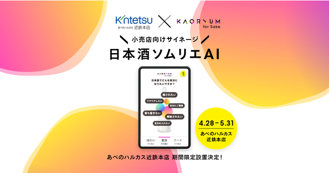 日本酒は酒類の中でも種類が豊富にあり、「どれを選んで良いか分からない」や「ラベルやパッケージを見ても選べない」といった意見が多く、初心者の方には購入ハードルが高い商品です。そこで、本実証実験では、感性をデータ化したAI である日本酒ソムリエAI「KAORIUM for Sake」が提供する”楽しく・迷わない”お酒選び体験を店頭にて提供することで、どのように消費者行動が変化するか、購買体験の向上に繋がるかなどを検証いたします。
