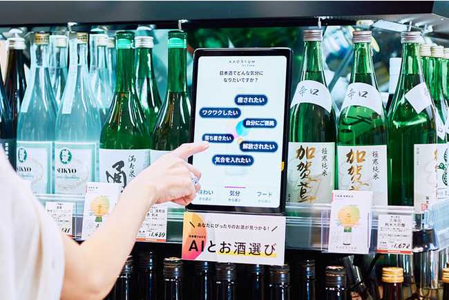ことで、気分やニーズに合わせて日本酒を探せるAI システム「KAORIUM for Sake」小売店向けサイネージを使った