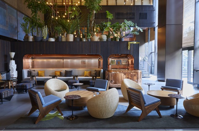 コンセプトが「East Meets West」のエースホテル京都は、著名建築家・隈研吾氏、長年のパートナーであるコミューンデザインとのコラボレーションにより、「イースト ミーツ ウエスト」というコンセプトのもとデザインされた。日本とアメリカ西海岸のアーティストや職人によるクラフト、自然、地域の素材、カスタムアート。「美的哲学、アイデアと伝統」がバランスよく融合された、新しい感覚の空間・アート作品を、宴会場、客室だけでなく館内のいたる所に配置。