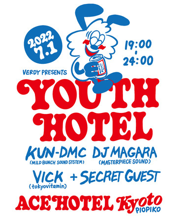 エースホテル京都(所在地:京都市中京区、総支配人:ニコラス=ジェームス・ブラック)は、「ガールズ ドント クライ(Girls Don’t Cry)」や「ウエイステッド ユース(Wasted Youth)」などのプロジェクトを手掛け、東京のストリートシーンに欠かせないアーティスト:ヴェルディ(VERDY)氏を招き、一夜限定DJイベント VERDY × Ace Hotel Kyoto 『YOUTH HOTEL』を、2022年7月1日(金)、同ホテルの2階に位置するバー & タコスラウンジのピオピコ(PIOPIKO)で開催します。