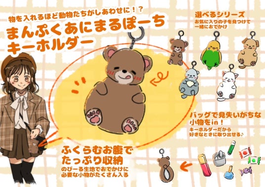 製品化した『まんぷくあにまるぽーちキーホルダー』