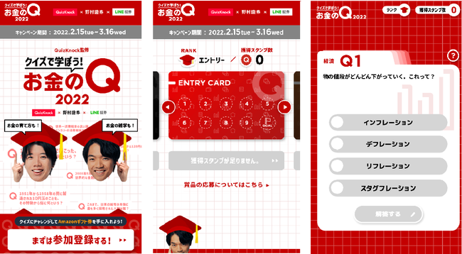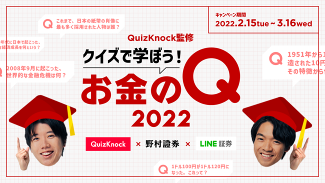 野村證券株式会社(代表取締役社長:奥田健太郎、以下「当社」)は、LINE証券株式会社(代表取締役Co-CEO:正木美雪・米永吉和、以下「LINE証券」)と共同で、2022年2月15日(火)より、楽しみながらお金の知識が身につくキャンペーン「QuizKnock監修 クイズで学ぼう!お金のQ 2022」(以下「本キャンペーン」)を開催します。