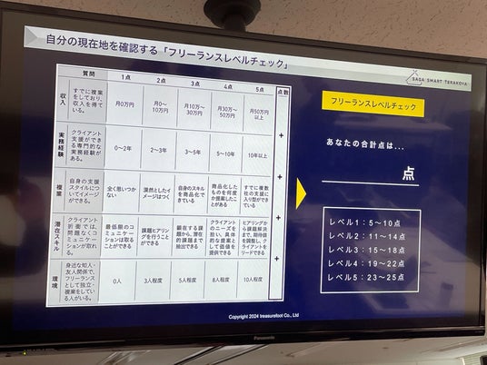 自分の現在地を把握するための「フリーランスレベルチェック」を実施し、実際にフリーランス・複業で案件を獲得している4名の事例をもとに、レベルの上げ方を解説しました。その後、「売れる商品の種」を作るためにビジネスにおける基本スキルシート(全35項目)のセルフチェックや、フローティングシートを活用したスキル・趣味・特技の洗い出しワークを実施しています。洗い出した要素をもとに、個人・ペアワークを通じて要素を掛け合わせた「商品の種」を設計しました。