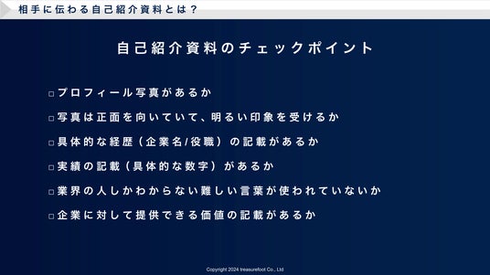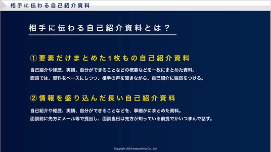 起業・複業の初期段階では自分自身を売り込んでくれる営業部門がありません。そこで、案件を獲得するためには「営業ツール=自己紹介資料」を作成するところから準備が必要です。これまで弊社を通じて複業に取り組んできた方の実際の自己紹介資料を見ながら、「相手に伝わる自己紹介資料」のポイントを解説していきます。その上で、これまでの経歴や実績、提供できる商品など、テンプレートを活用しながら、実際に自己紹介資料を作成し、作った資料を活用した自己紹介ロールプレイングを行います。