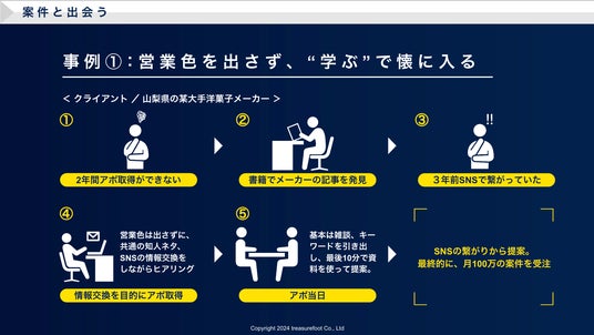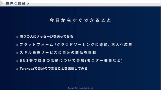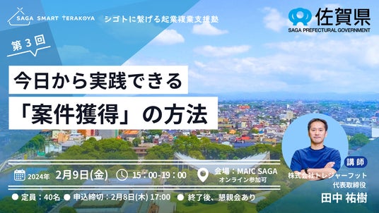 この度、株式会社トレジャーフットでは、佐賀県「令和5年度 IT人材起業・副業等活躍推進事業」を受託し、2月9日(金)に「今日から実践できる『案件獲得』の方法」を開催いたします。第3回目の今回の講座では、起業・複業において仕事を獲得するために必要な自己紹介資料の作り方や、仕事を引き寄せるセルフブランディング、攻めの案件獲得方法など、「効果的な営業手法」を徹底解説。案件獲得における3つのポイントを押さえながら、講座終了後、すぐに第一歩を踏み出せる状態を作っていきます。