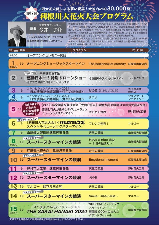 「第37回利根川大花火大会」の大会プログラムを公開いたしました。本年は音楽プロデューサーに今井了介氏をお迎えし、4大花火師が“選りすぐりの楽曲”とともに境町の夜空を彩ります
