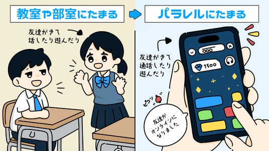 「パラレル」は、2019年にサービス提供を開始した「オンラインのたまり場」アプリです。オンライン上に友達の家や部室、放課後の教室のような空間を再現し、ゲーム・動画・音楽などのエンタメコンテンツなどを仲の良い友達と一緒に楽しむことができるソーシャルスペースを提供しています。