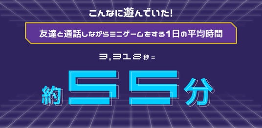 友達と通話しながらミニゲームで遊ぶ1日の平均時間は「3,318秒=約55分」となりました。