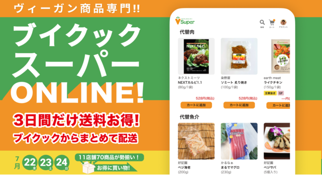 ヴィーガン生活を支えるスタートアップ株式会社ブイクック(本社:神戸市、代表取締役:工藤柊)は、7月22日(金)より3日間限定で「ブイクックスーパーONLINE!」を開店します。11店舗70商品から、好きな商品をまとめて購入することができます。
